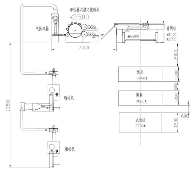 碳纖維生產(chǎn)線工藝流程:粗開松機(jī)→集棉箱→精開松機(jī)→半氣壓棉箱→單錫林雙道夫梳理機(jī)→鋪網(wǎng)機(jī)→針刺機(jī)(預(yù)刺機(jī)、倒刺機(jī))→成卷機(jī)。